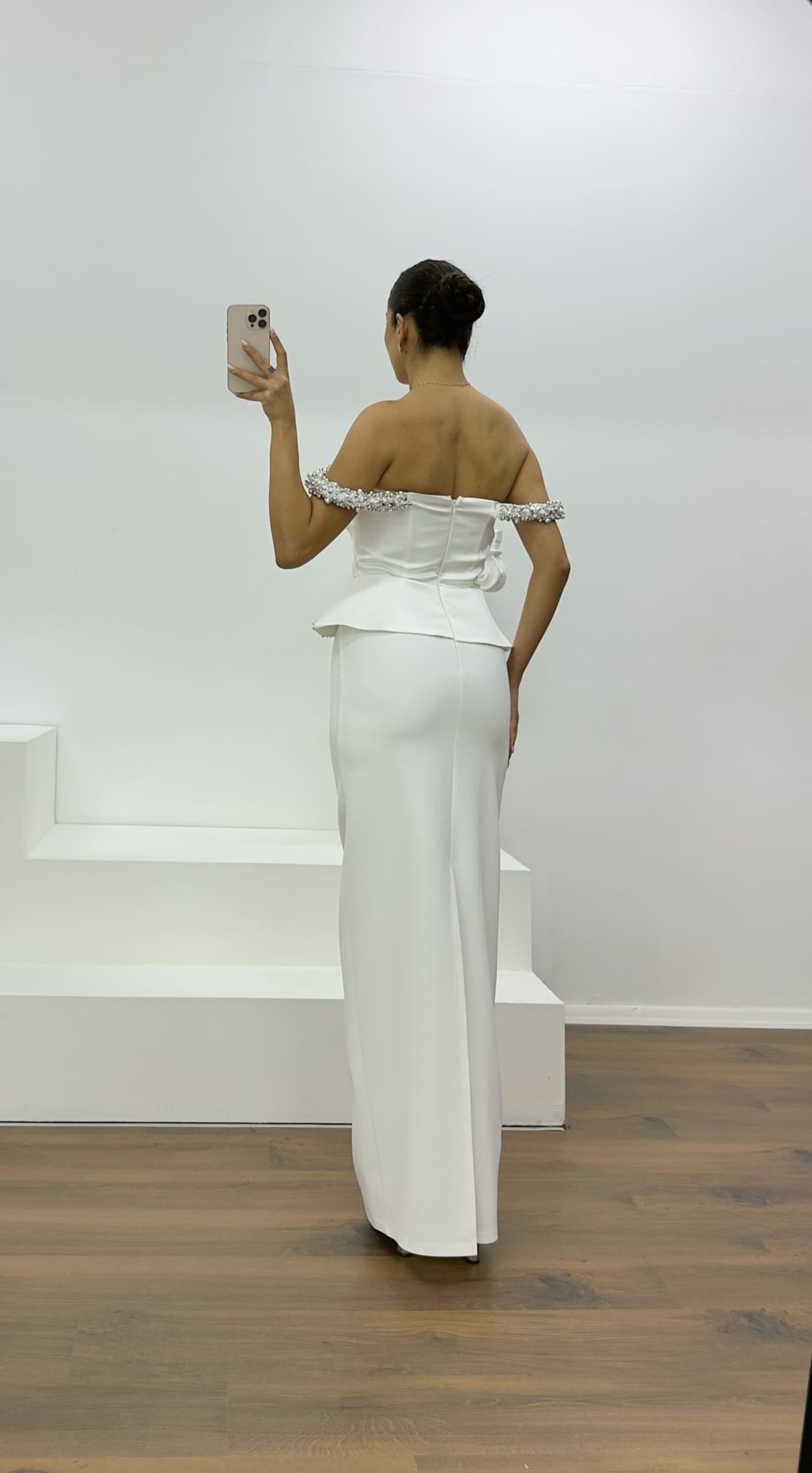 • Kemik Boncuk İşlemeli Straplez Kalem Abiye Elbise