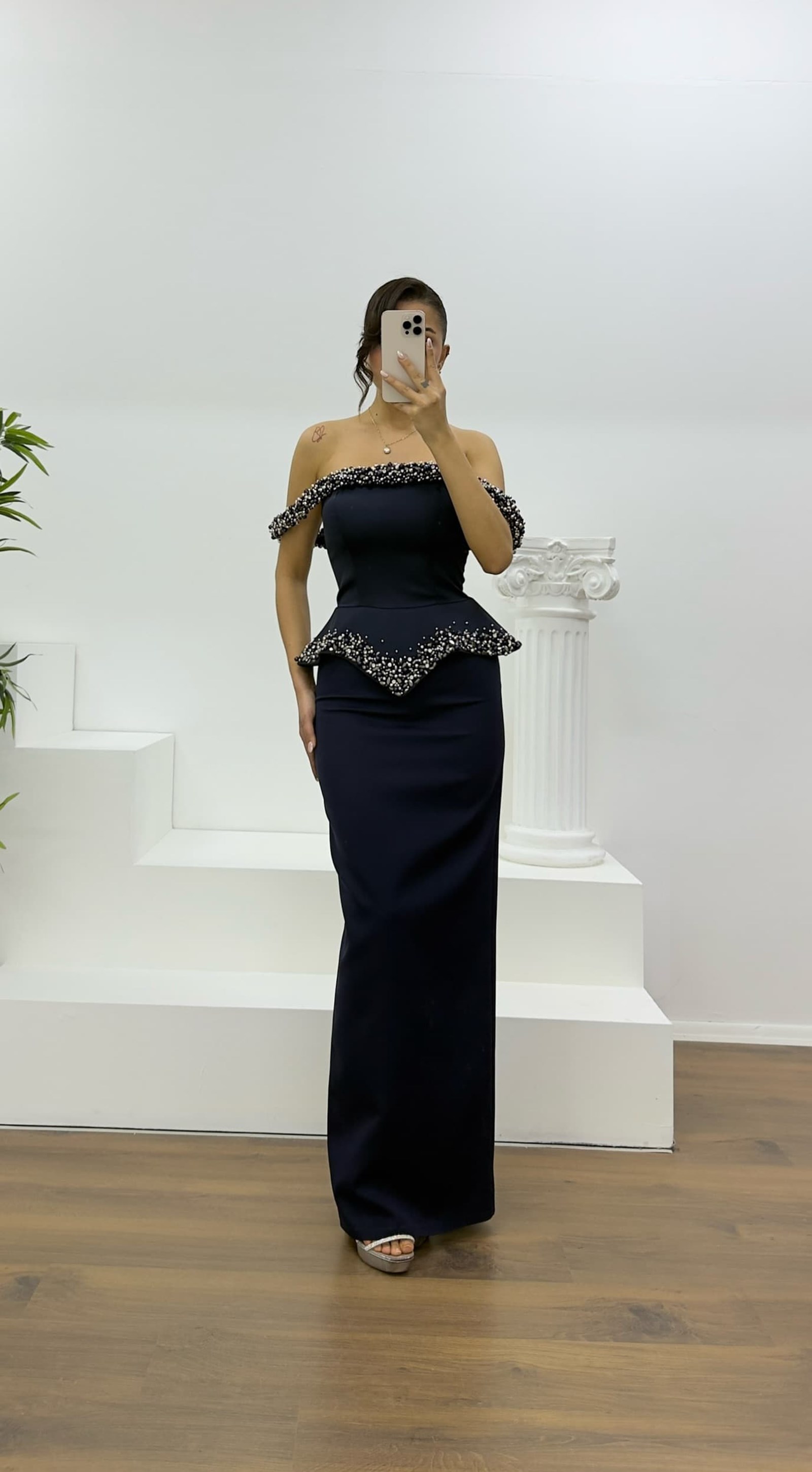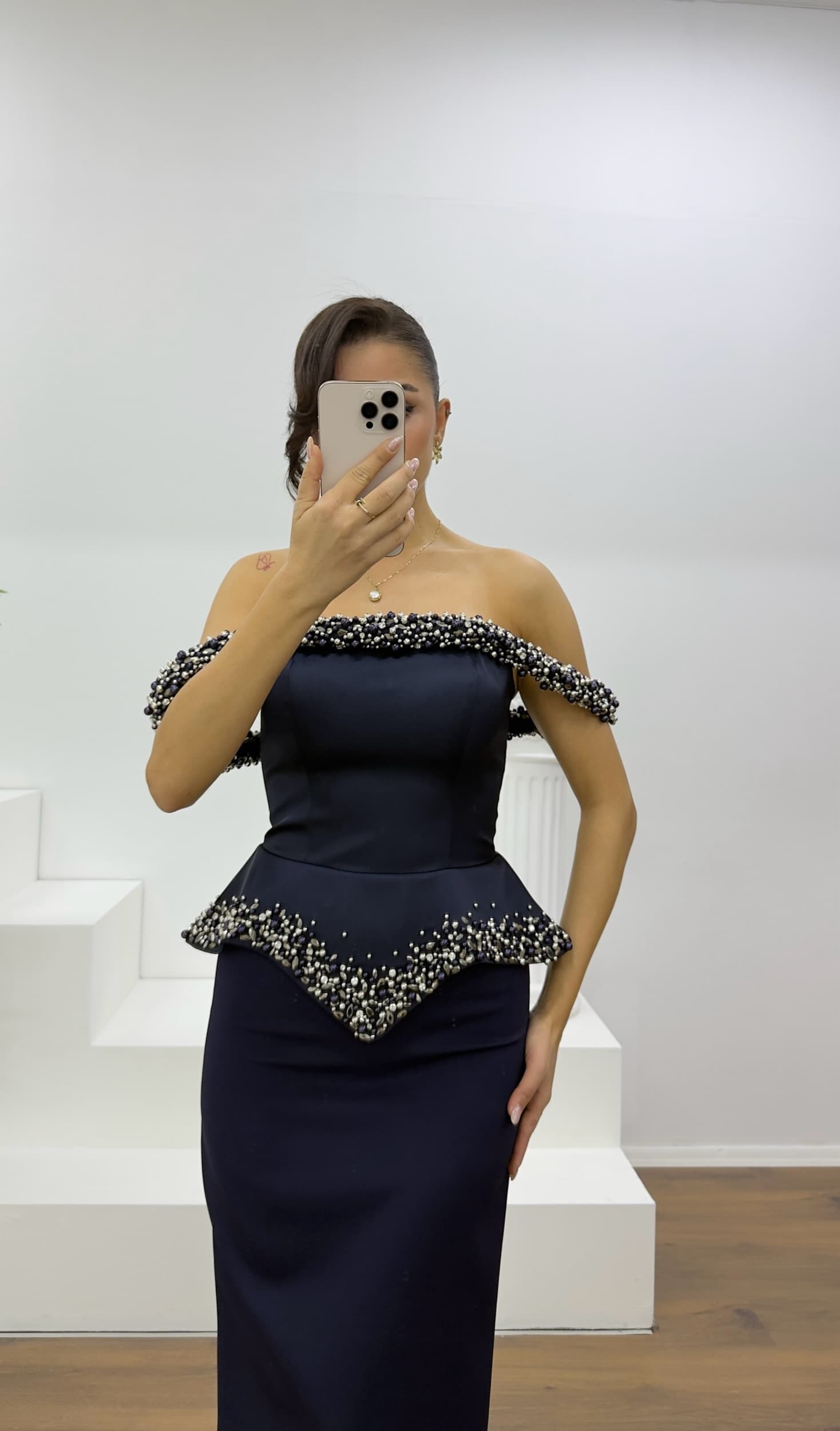 • Lacivert Boncuk İşlemeli Straplez Kalem Abiye Elbise