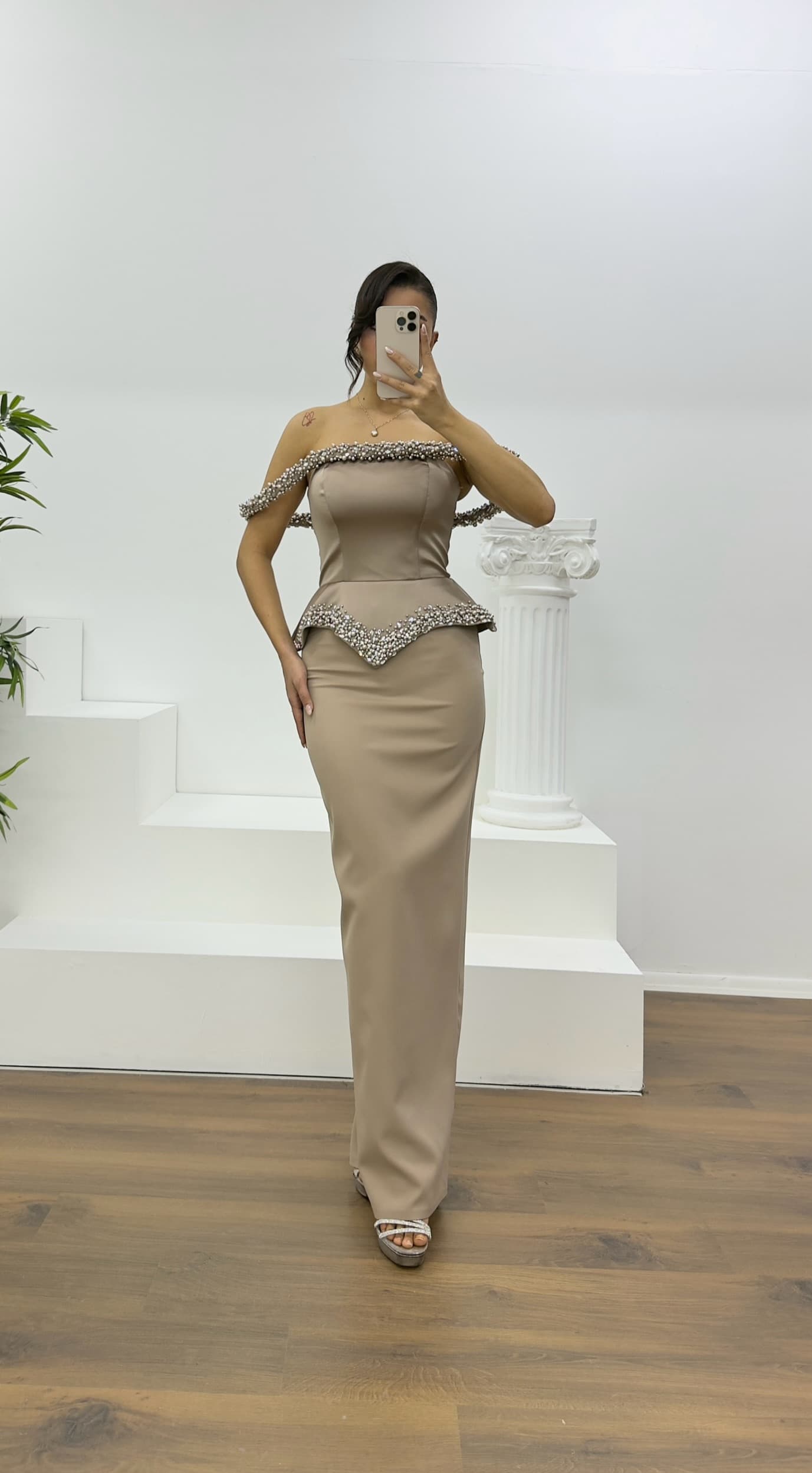 • Kahve Boncuk İşlemeli Straplez Kalem Abiye Elbise