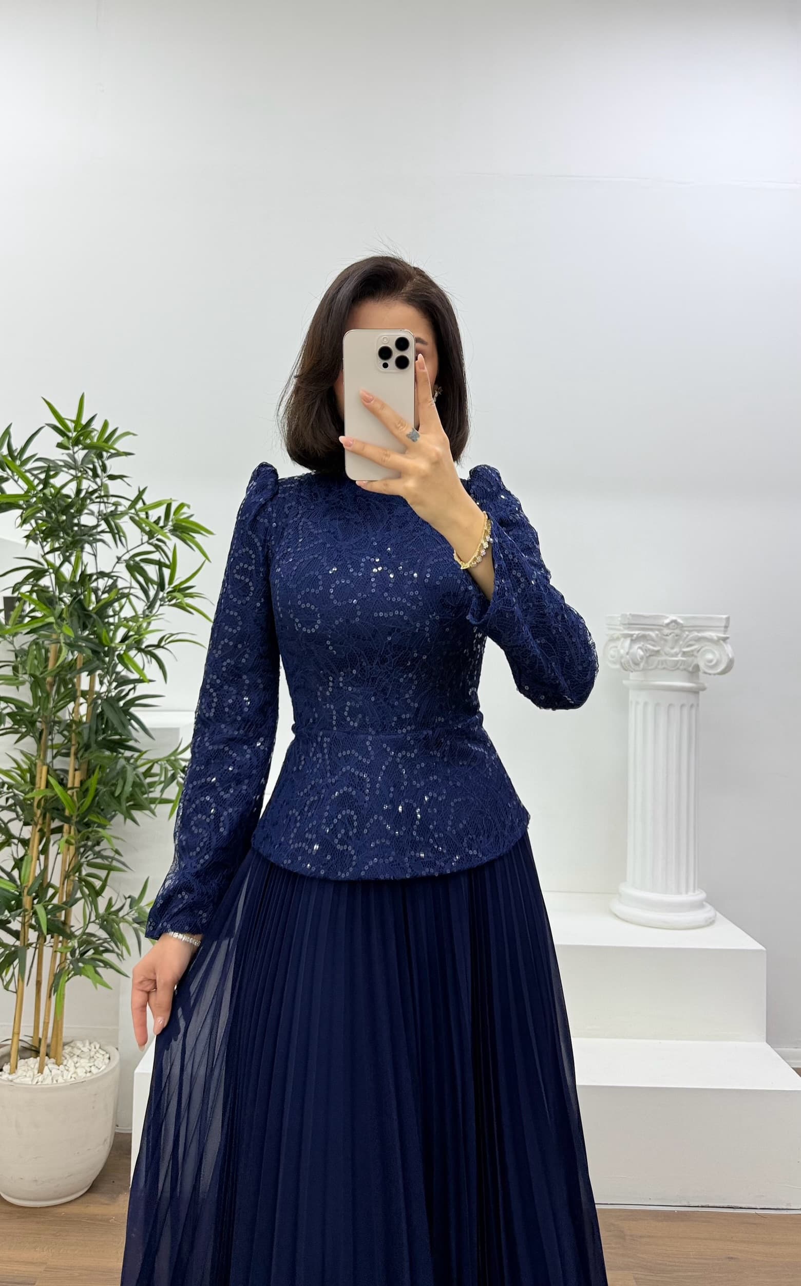 • Navy Blue Lace Pleated Modest Evening Dress
